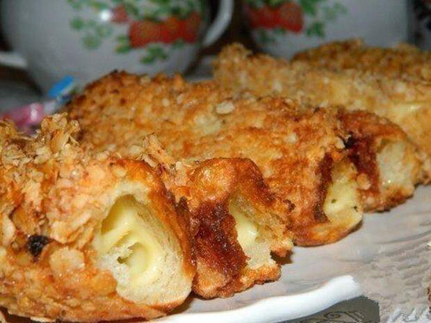 Скручиваем хлеб с сыром в рулет, обмакиваем в яйцо, затем в овсяные хлопья.