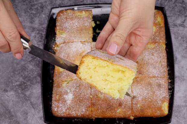 Остывший пирог посыпаем сахарной пудрой или поливаем растопленным шоколадом. Можно сделать быстрый крем из сметаны или сливок с сахарной пудрой.