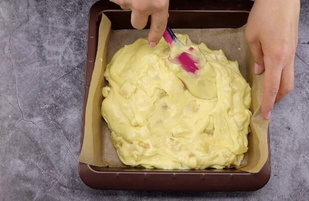 Форму для запекания застилаем пергаментом и выкладываем тесто, разравниваем.